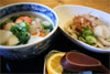 | ぶっかけうどんと、温かいうどん(天ぷらうどんを除く)を、半分ずつ食べられるセットです。 | 当店自慢の山菜料理や手作り豆腐と、ミニうどんがセットになったお得な定食を提供しております。当店で使用しているお米は道産米です。 | ||||