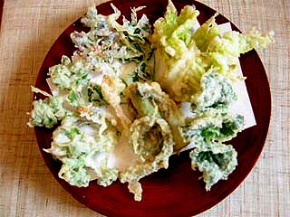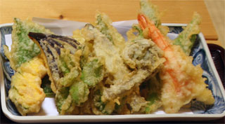 天ぷら盛り合わせ 1,300円 大葉、うどの葉、えび、 ヤマメ、かぼちゃ、なす |