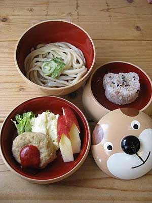 お子様御膳 710円 かわいい犬のお重の中には、お子様が大好きなハンバーグ、ポテトサラダ、うどん、おにぎりが入ってます。 | ||||