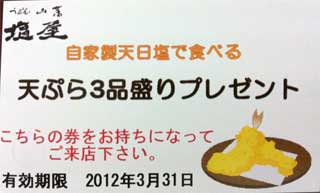 | 123, 天ぷら3品盛りプレゼント中! (2012/3/5) |